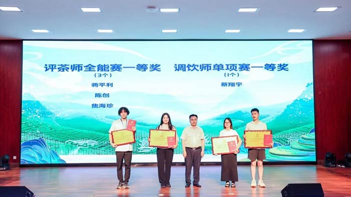 集團(tuán)茶守藝蔡翔宇、毛俊分別獲得調(diào)飲師單項(xiàng)賽一等獎(jiǎng)和二等獎(jiǎng)。